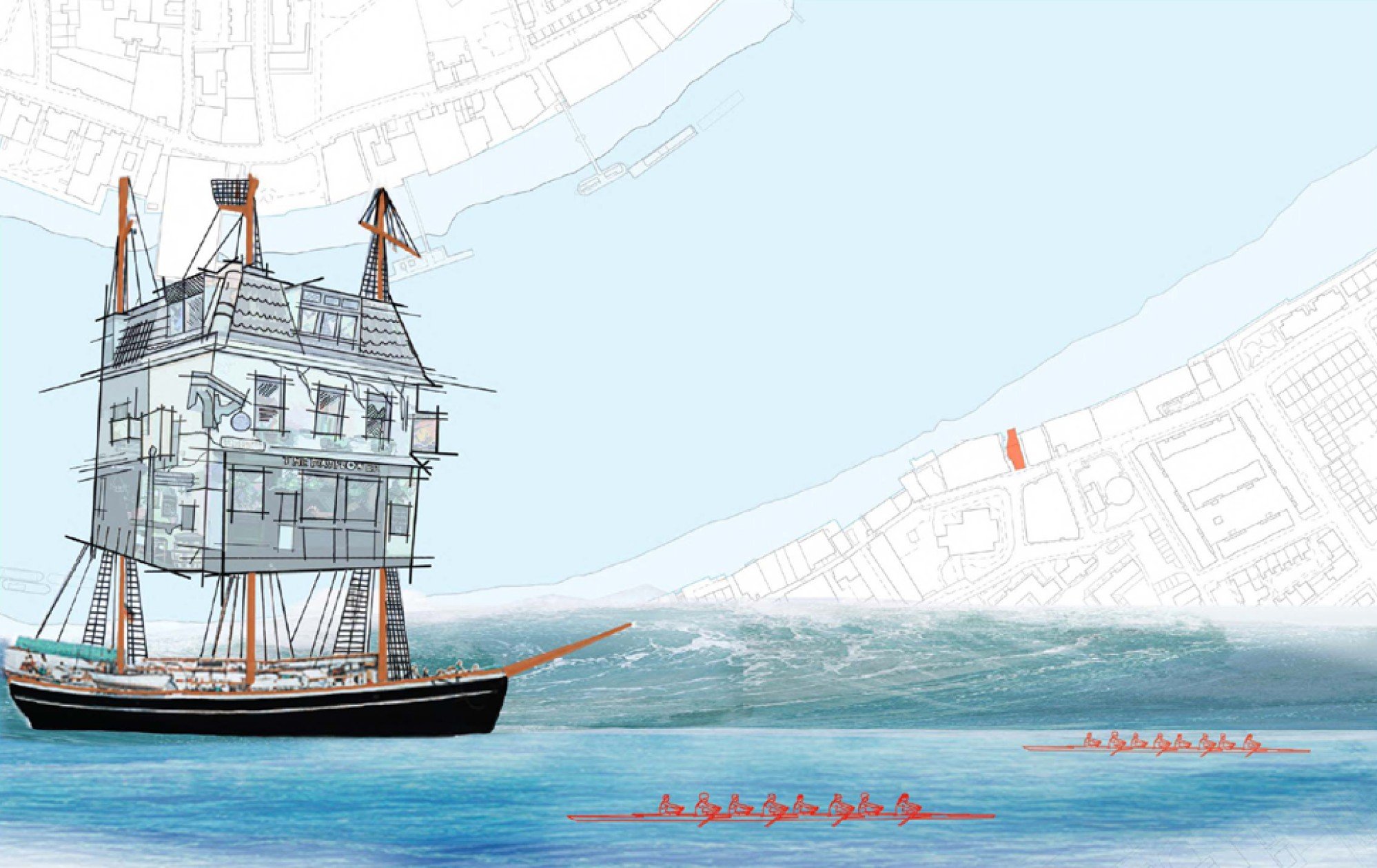 My clients for this project are two avid rowers also working as professionals in the City of London. By towing their Tiny House via boat, they are able to moor at prime rowing locations along the Thames in their spare time. Reminiscent of the Mayflower ship, this structure floats upon the river and features three core masts, the function of which allow the building to either dock bankside within a fixed steel frame whilst in the lower position or be transported when raised. Through using a corkscrew mechanisim, the masts can be manually transformed vertically through the building by means of a turning cog as seen in the detail drawing.